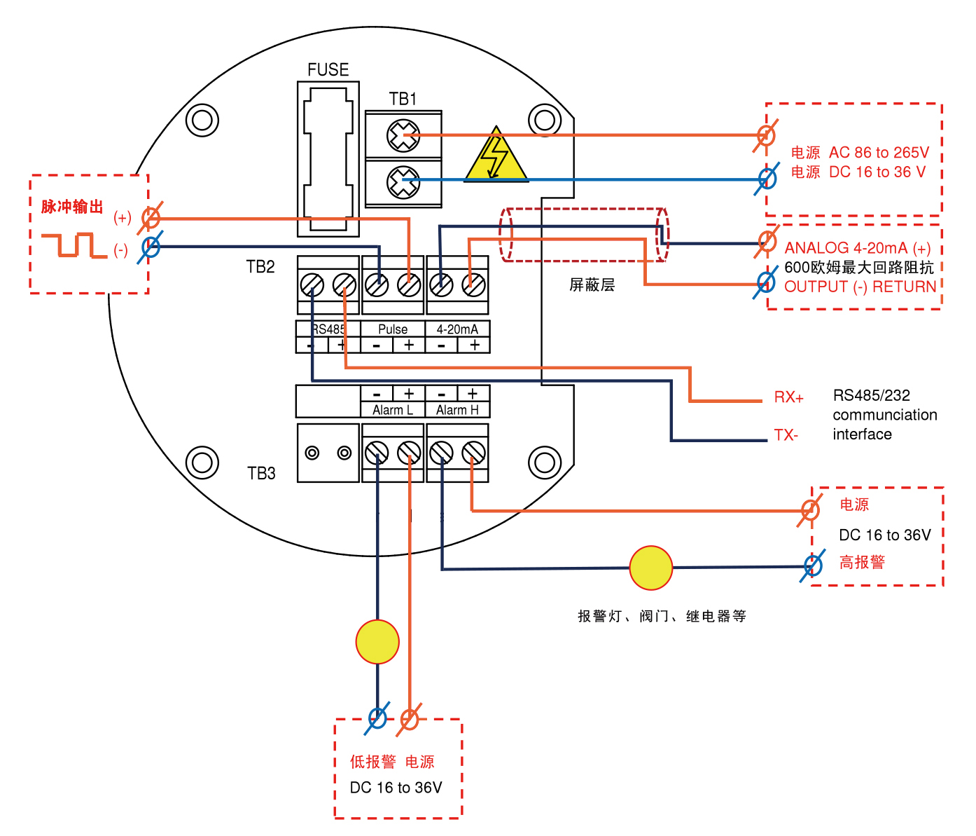 4、高低報警回路的驅(qū)動能力為:24VDC,30mA,可以驅(qū)動繼電器,閥門和報警燈