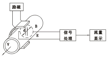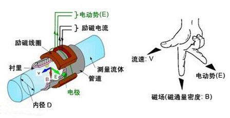 電磁流量計的基本原理是法拉第電磁感應定律,即測量管內的導電介質相當于法拉第試驗中的導電金屬棒,兩端的兩個電磁線圈產生恒定磁場。當有導電介質流過時,就會產生感應電動勢。電動勢的方向根據“弗萊明右手定則”,感應電動勢的大小由下式確定:
