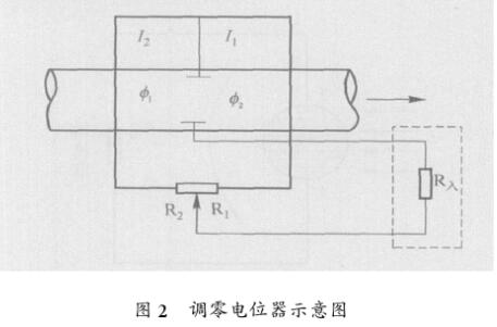 在污水電磁流量計變送器的結構中,應使閉環的平面與交變磁力線保持平行,以避免磁力線通過閉環,并應設置千擾調節機構,以減少千擾。干擾信號ET。另外,在變壓器干式饋線上設置零電位器。如圖2所示。兩根導線從一個電極引出,分別繞過磁極形成兩個回路。當磁力線被共同保護以通過閉合回路時,有必要在兩個回路中沿相反的方向產生感應電勢。因此,在兩個回路中存在相反方向的電流I1和I2。通過調節零電位器,R輸入上兩個電路中的電流I1和I2產生的電位相互抵消,以減少90°干擾信號。