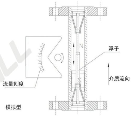 由就地指示器中的隨動磁鋼與浮子內磁鋼耦合;而發生轉動,同時電動指針。通過刻度盤指示出此時流量大小。(如下左圖所示)