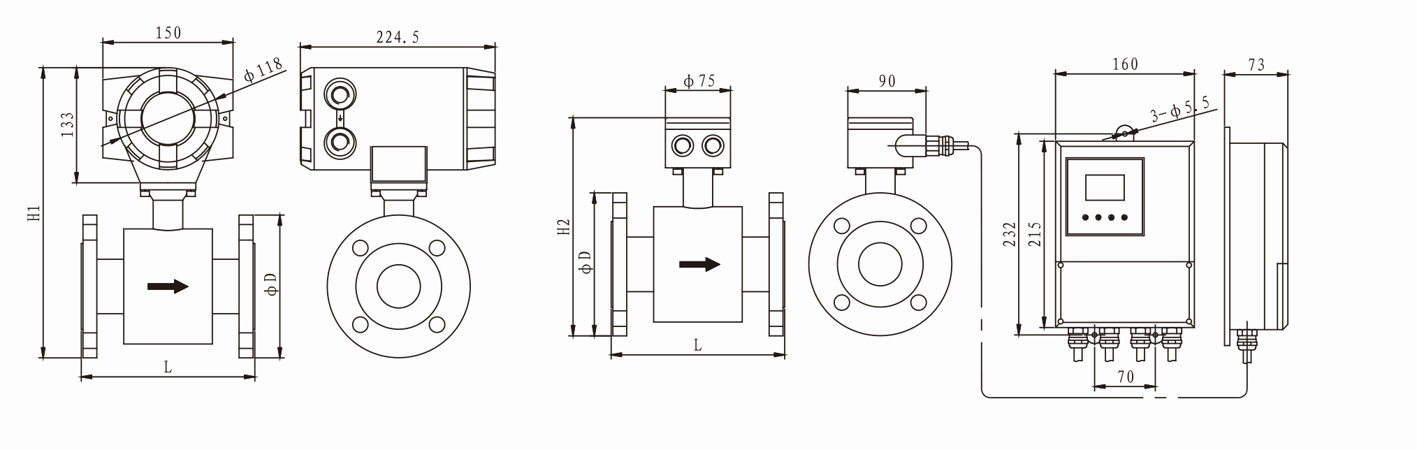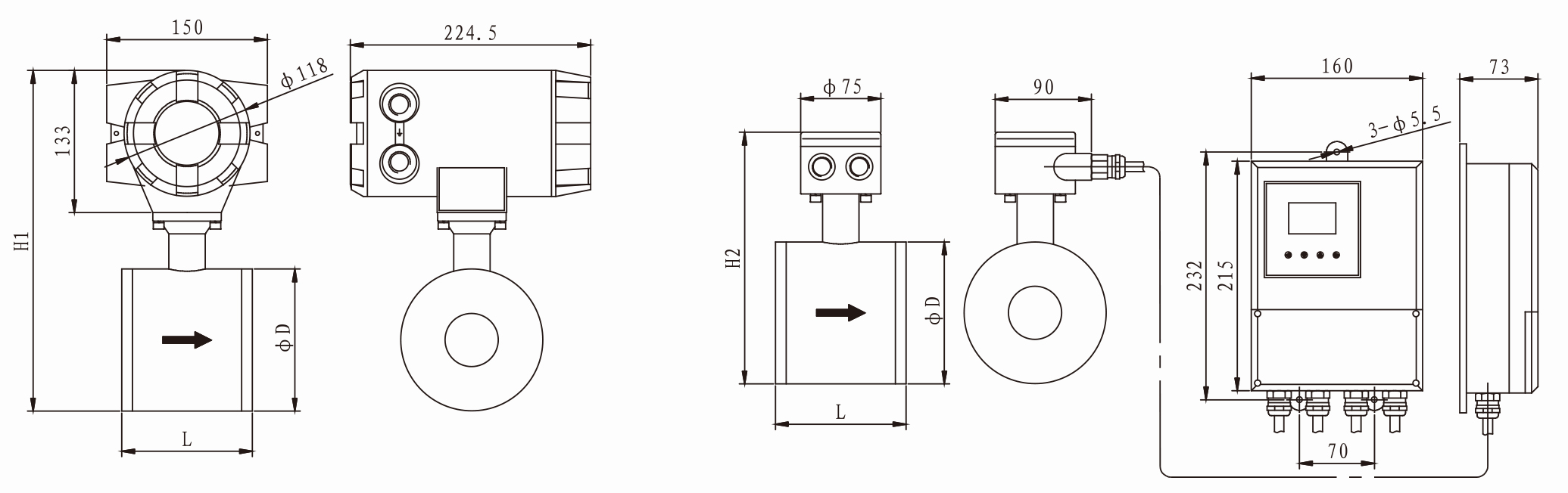 分體型是電磁流量計較普遍的應用形式。傳感器單獨接在工藝管道上,轉換器安裝在相距數米或百余米的其他地方,中間用電纜相連接。分體型的流量計可以使得轉換器遠離環境比較惡劣的現場,也便于觀測和調整設定的參數。