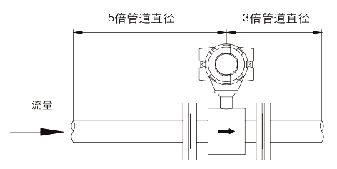 為了在不同的應用條件下確保說明書所表述的精度,安裝傳感器時應從電極面上游安裝五倍管徑的直管段,下游安裝三倍管徑的直管段,見下圖所示。這種安裝可以充分排出由于彎管、閥門或縮頸引起的干擾。當流量計前后的直管段不能滿足要求時,性能指標會有一定偏差。