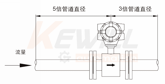 為了在不同的應(yīng)用條件下確保說明書所表述的精度,安裝傳感器時(shí)應(yīng)從電極面上游安裝五倍管徑的直管段,下游安裝三倍管徑的直管段,見下圖所示。這種安裝可以充分排出由于彎管、閥門或縮頸引起的干擾。當(dāng)流量計(jì)前后的直管段不能滿足要求時(shí),性能指標(biāo)會有一定偏差。