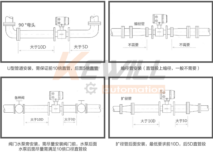 1)盡量避免鐵磁性物體及具體強電磁場的設(shè)備(如大電機、大變壓器的等),以免磁場影響傳感器的工作磁場和流量信息。