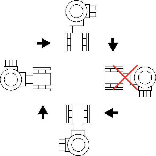注: 對于含有固體顆粒的液體或者漿液建議垂直安裝,流向由下至上,這是因為雜質容易在測量管底部產生沉淀,具體安裝參照直管段安裝說明。