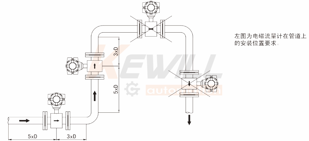 為了在不同的應用條件下確保說明書所表述的精度,安裝傳感器時應從電極面上游安裝五倍管徑的直管段,下游安裝三倍管徑的直管段,見下圖所示。這種安裝可以充分排出由于彎管、閥門或縮頸引起的干擾。當流量計前后的直管段不能滿足要求時,性能指標會有一定偏差。