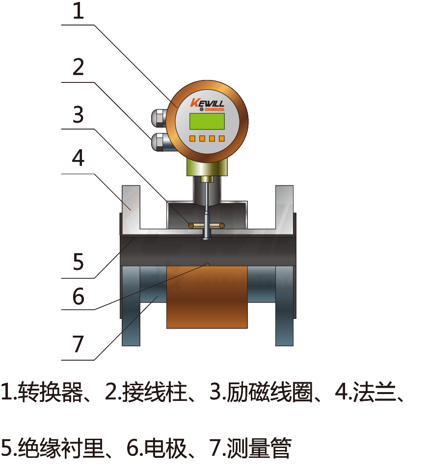 測量流量時,導電性液體以速度V流過垂直于流量方向的磁場,導電性液體的流動感應出一個與平均流速成正比的電壓,其感應電壓信號通過二個或二個以上與液體直接接觸的感應電極檢出,并通過電纜送至轉換器通過其智能化處理,實現流體瞬時流量、積累流量的顯示及流量數據與控制系統之間的通訊。測量管內無活動及阻流部件,因此幾乎沒有壓力損失,并且有很高的可靠性。