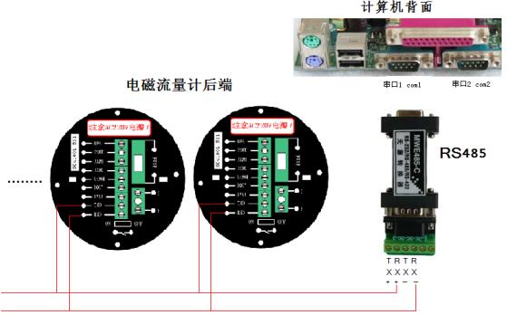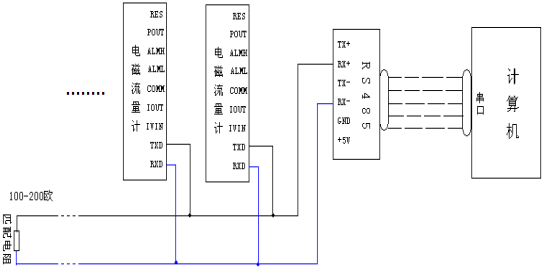 電磁流量計的TXD和RXD與RX+和RX-(TX+和TX-也可以)連接,如果線長,請在遠端加一個100-200歐的匹配電阻,然后將RS485插入 電腦的串口。