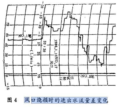 二、風口為原廠設備,損壞較多,一年半內共29次,第二次報警達到1次,確實屬于風口燒壞、屯'彎折或排水等原因造成的 管道泄漏報警僅12次。 一個典型的案例是在 1986 年 10 月 10 日到 2003 年左右,沒有。 27 風口燒壞,儀表立即報警,檢查確認后,立即更換其余機構,卸載風口前圈已被燒毀。 自動記錄儀記錄的△Q變化如圖4所示,圖中兩條線分別用兩支筆記錄。 下面的線是正常風口,而上面劇烈波動的是17號風口隨時間變化的△Q曲線。
